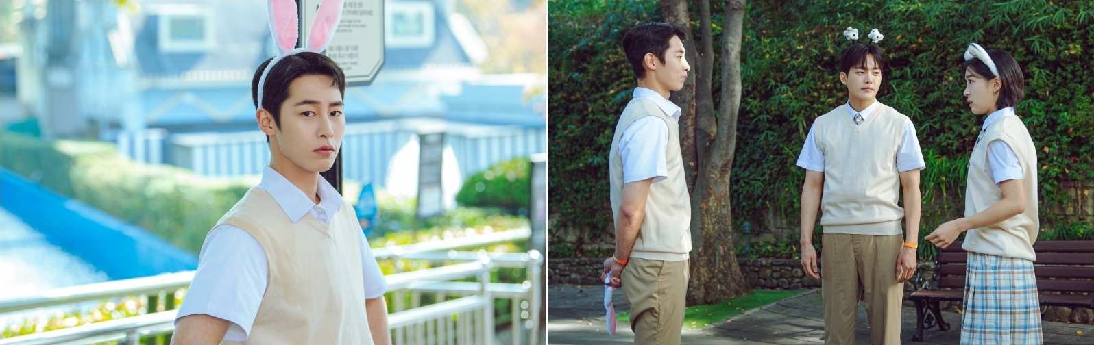 In newly released stills from the drama’s next episode, the trio enjoys an outing at the amusement park in matching school uniforms and cute animal headbands. With their love triangle more tense than ever, the photos raise the question of why the three of them wound up at the amusement park together.