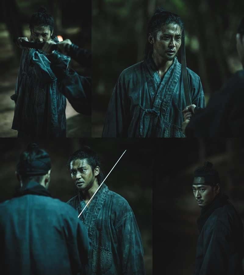However, the newly released stills capture a shocking moment under the dark night sky—Jeong Cheon pointing a sword at Si Yool’s throat—raising questions about what could have driven the two apart.