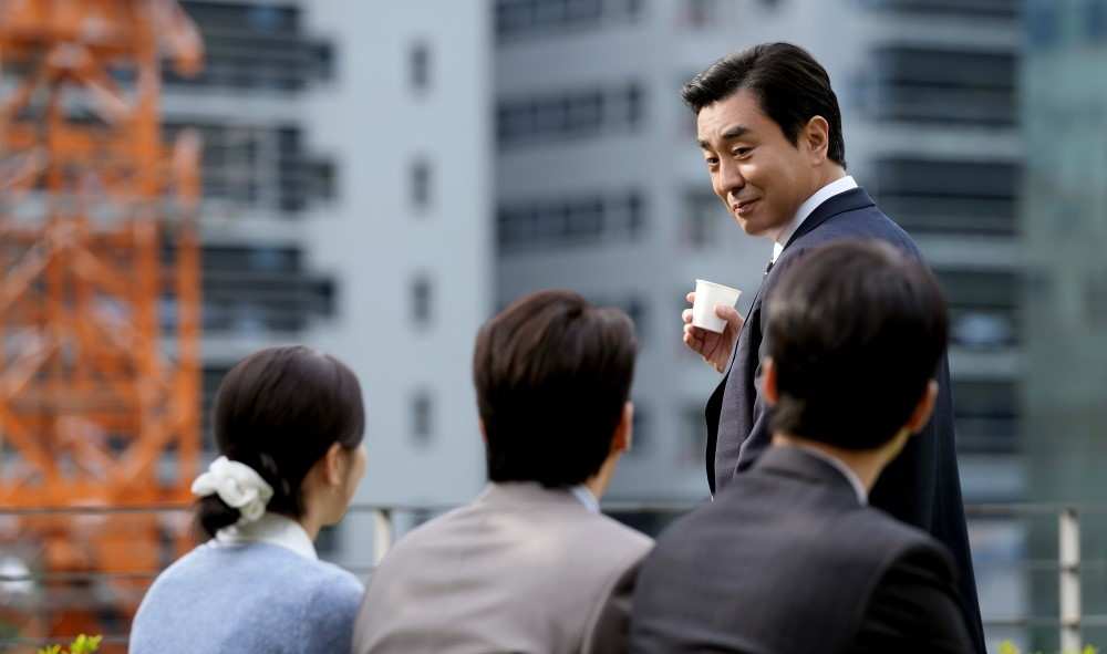 The stills reveal Kim Nak Soo’s daily routine. After arriving at the office, he sips a cup of coffee while giving a long lecture to his junior colleagues, his relaxed smile showing the confidence of a corporate manager.