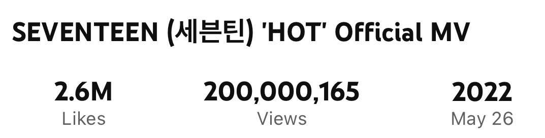 SEVENTEEN originally released the music video for “HOT” on May 27, 2022 at 1 p.m. KST, meaning that it took three years, three months, and 19 days to reach 200 million views.