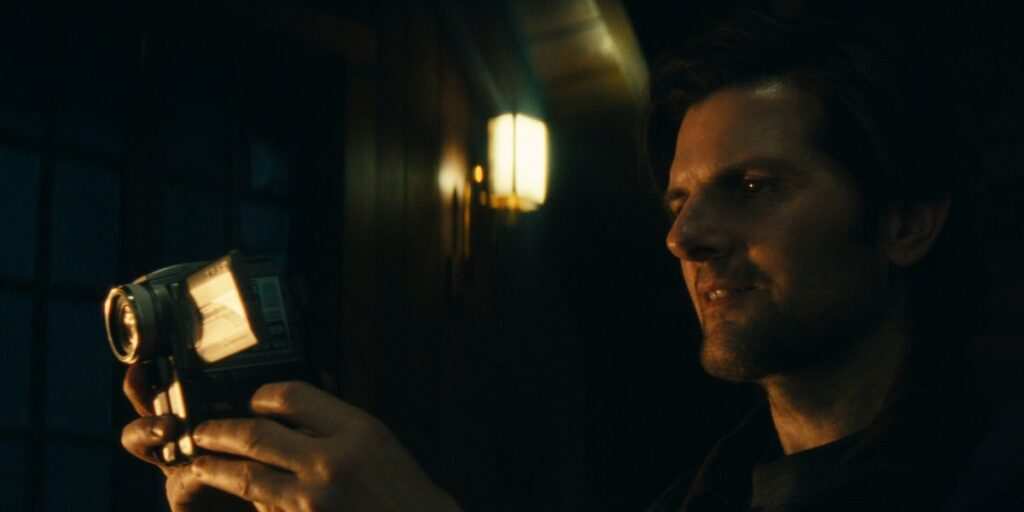 Adam Scott holding a camera in his hand and smiling in Severance, which won big at the Emmys 2025